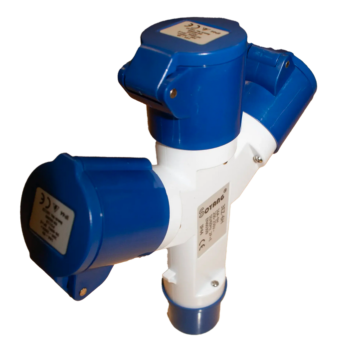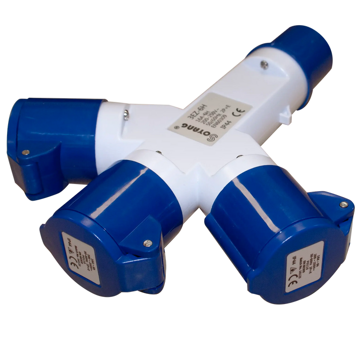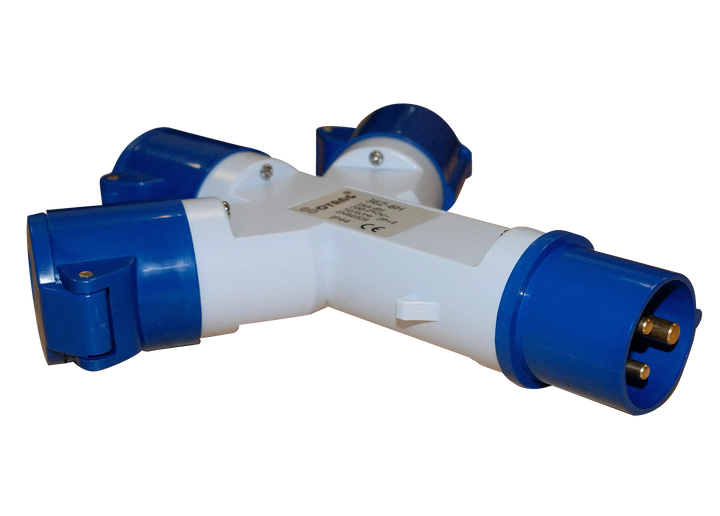3-way mains power splitter to suit caravan site power outlets and generators. This adaptor plugs into the standard site power socket and allows 3 mains cables to be connected