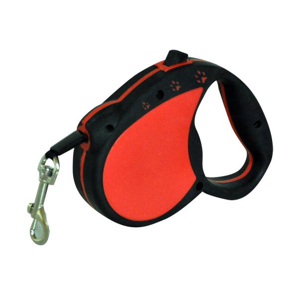 5m retractable dog lead for medium dogs up to 25kg. Lead made of strong fabric tape with stylish black and red plastic rubber grip handle.