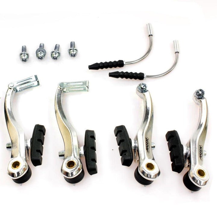 Set of front and rear linear pull brake arms (V-brakes) for mountain bikes, touring bikes, tandems and any other bike frames with cantilever brake mounting bosses. Set of front and rear brake arms includes brake blocks for alloy wheel rims, cable pipes and gaiters and securing bolts.