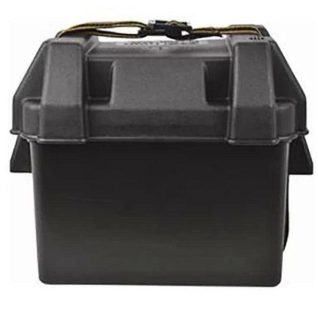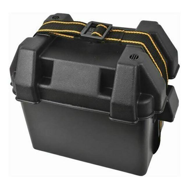 A battery securing box suitable for use with caravan, campervan and boat leisure batteries. Manufactured in a tough, durable, acid-resistant and chamical-resistant polypropylene plastic, the battery box has a lift-off lid for access and maintenance, secured with a strap. Designed for use with caravan leisure batteries up to 85 Amp/Hour, to hold the battery securely to prevent it moving, tipping or spilling.