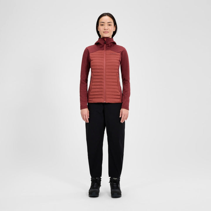 This highly effective combination of synthetic insulation and knitted fleece is excellent for active days on the mountain. The Berghaus Nula Women's Hybrid Jacket in Corundum Red masterfully blends advanced Hydroloft® insulation with breathable knitted fleece, offering unparalleled warmth, freedom of movement, and packable convenience for cool-weather adventures.