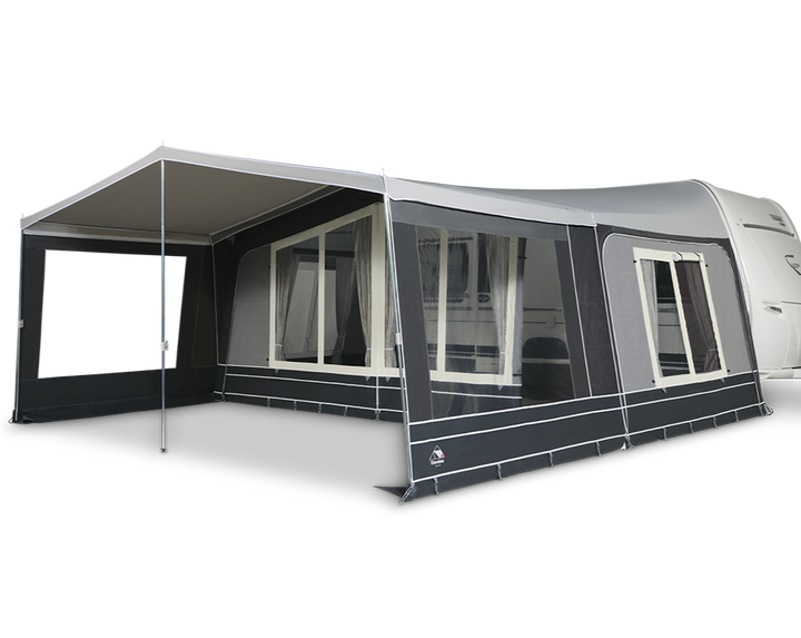 Designed for the camper who wishes to create an additional extension to their awning. The Locarno Plus awning canopy will fit all Dorema full awnings models. The canopy is secured to the awning by a plastic figure of 8 profile on the awning canopy. The side walls are included as standard for both left and right sides to protect against the elements. The canopy is made entirely of European TenCate All Season quality coated polyester material.