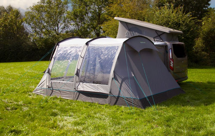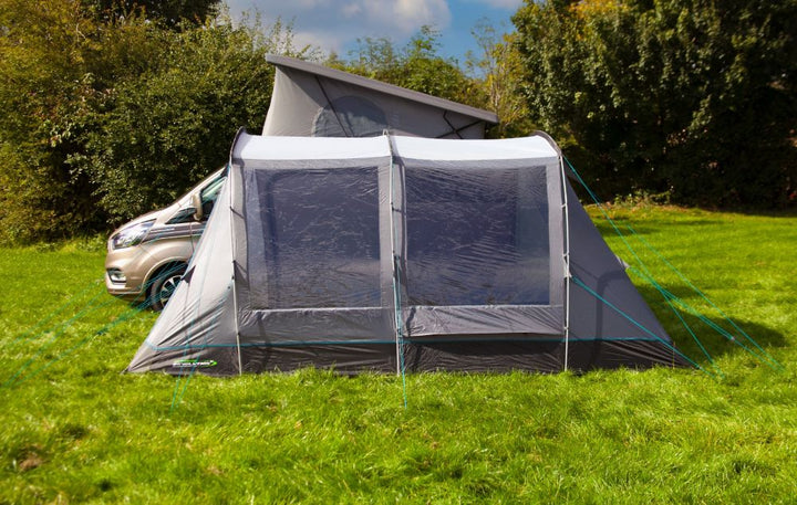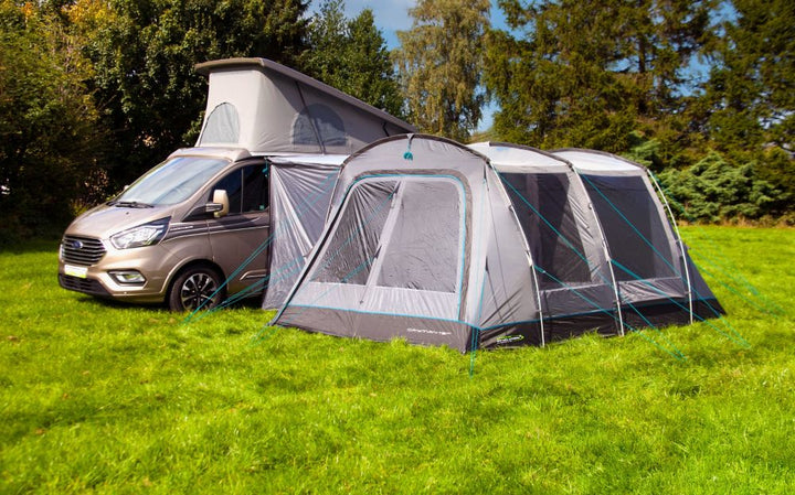 This model has been produced from a premium ultra-lightweight 120HDE (High Density Endurance) Hex embossed fabric weave, which has been specifically engineered to deliver lightweight, compact and visually contemporary products that pack away neatly into the inclusive carry bag. This makes it perfect for small to medium sized campervans where weight and space limitations are of consideration. The fabric incorporates a 3,000mm Hydrostatic Head and employs fully taped seams throughout, meaning it is exceptionally waterproof and rain will simply bead onto the surface, before rolling off. The sleek design lines & natural tri colour livery with new teal highlights will coordinate & complement any campervan or motorhome.