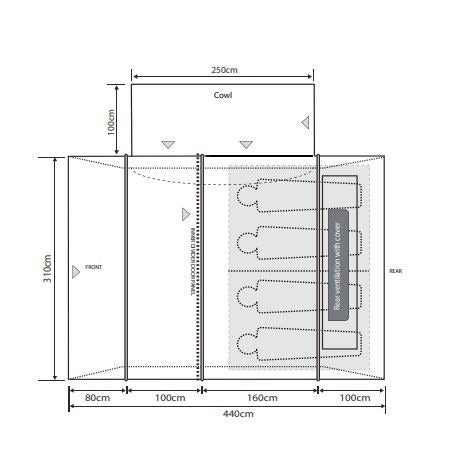 • Fully sewn in PE groundsheet with fold down access door up stands