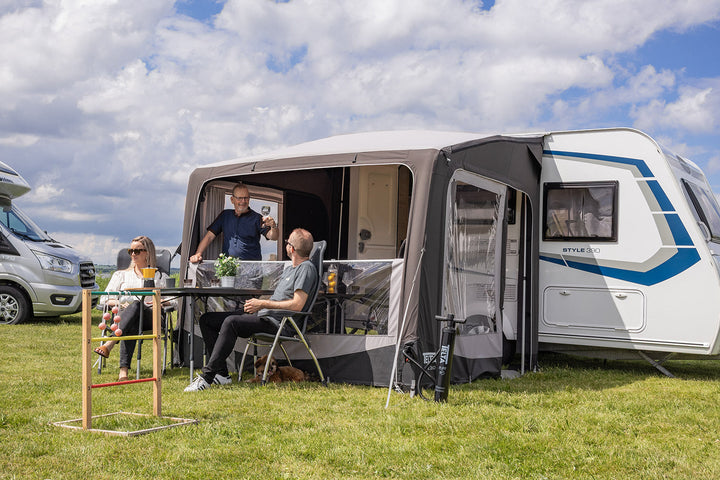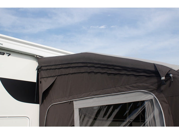The Telta Pure 260 awning is versatile, fitting both caravans and motorhomes. The single point inflation makes putting it up a breeze. The unique Teltex awning fabric is weatherproof, lightweight and fully breathable reducing the chance of condensation. This product boasts a unique and functional front-panel that can be easily rolled into the center, up to the roof, or removed entirely. By rolling up the front-panel, you can quickly transform the awning into a sun canopy without the hassle of removing and storing the panel. The PVC bottom curve is easy to clean, while the quality audience curtains on all windows add to the overall appeal of the awning. Plus, the 260 model has strengthened tube sleeves that eliminate the need for a center tube, maximizing interior space and reducing the weight of the awning. This awning also comes with dual beading allowing it to fit into the cassette wind out awnings. Try the Telta Pure 260 today and experience its exceptional features for yourself!
