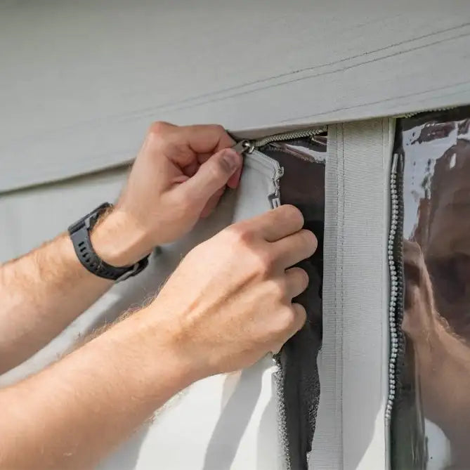 - Versatile Front Panels: The large panoramic windows can be secured back to act as a door, eliminating the need to roll and crease PVC.