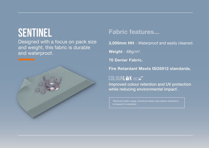 - Sentinel Fabric - When pack size and weight are the key factors in choosing your tent, our specifically designed Sentinel Fabric will surpass your needs. Sentinel is strong and durable, incorporates our ColourLok Eco technology for superior longevity, and is waterproof to a 4,000mm HH rating, ensuring great quality and performance coupled with compact pack sizes.